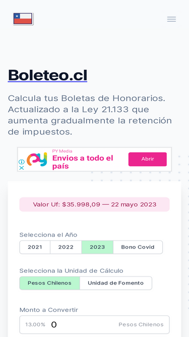 86%Calcula las Boletas de Honorarios con los montos válidos al 2025 incluido bono COVID y cálculo en UF. Calculadora gratuita actualizada con la Ley 21.133.
