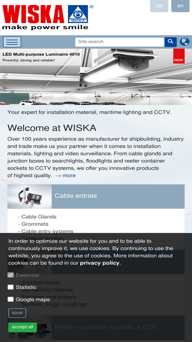 100%WISKA supplies cable glands, installation material, maritime lighting and CCTV, inter alia, for the maritime industry, shipbuilding, offshore facilities, electrical trade and transport engineering