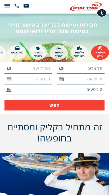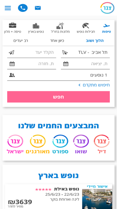 88%צבר תיירות בעלת נסיון רב בנופש בישראל ובחול אנו מציעים טיסות, חבילות נופש, טיסות זולות, מאורגנים, ונופש בארץ בהזמנת אונליין באישור מיידי כנסו עכשיו והזמינו צבר