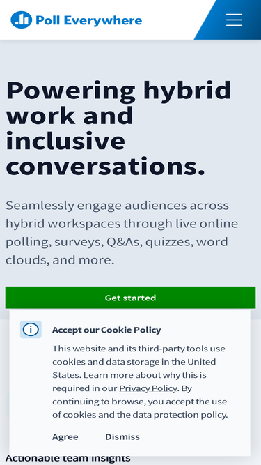 86%Poll Everywhere powers interactive meetings, classes, and events across the globe. Create a dialogue with the audience—using nothing more than the smartphones in their pockets—with stunning word clouds, insightful Q&As, even clickable images.