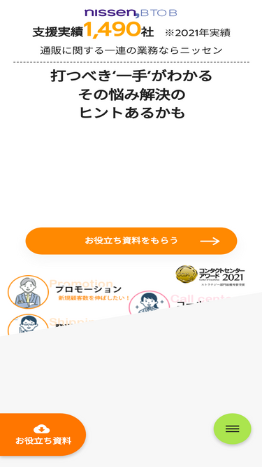 100%「通販のニッセン」の会員DB、ノウハウ、インフラを活かし、企業様に対して、プロモーションやテレマーケティング、フルフィルメント(物流支援・コールセンター)、同梱同送などのビジネスソリューションをご提供します。