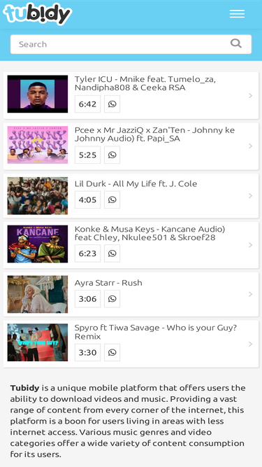 79%Tubidy is a free MP3 and MP4 music downloader that allows users to search and download songs online, widely used in Africa for mobile music.
