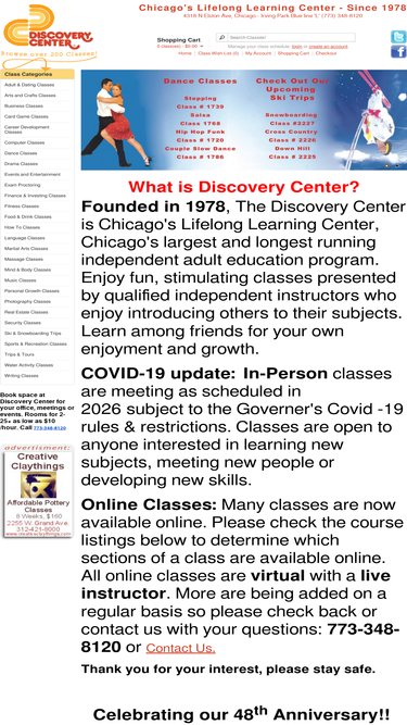 47%the discovery center is chicago's lifelong learning center. as chicago's largest and longest running independent adult education program, we present fun, stimulating classes by qualified independent instructors who enjoy introducing others to their subjects. learn among friends for your own enjoyment and growth, no exams, grades or degrees. suggestions or comments always welcome. see for yourself what lifelong learning can be! discover center chicago classes.