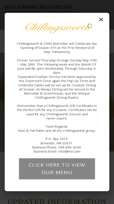 79%chillingsworth fine dining & chills bistro bar in brewster, ma. call us at (508) 896-3640. check out our location and hours, and latest menu with photos and reviews.