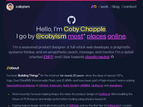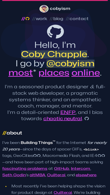 91%👋 hello, i’m coby chapple.i go by @cobyism most* places online. i’m a seasoned product designer & full-stack web developer, a pragmatic systems thinker, and an empathetic coach, manager, and mentor. i’m a detail-oriented enfp, my preferred pronouns are he/they, and i typically bias towards chaotic neutral. 👻 //about i’ve been building things™ for the internet for nearly 20 years—since the days of spacer gifs, tags, geocities🏠🚧, macromedia flash, and ie4🌐😬—and have been part of high-impact teams solving fascinating problems at github, intercom, seth godin’s altmba, and elsewhere. i'm currently working at quilter. we’re building the future of pcb layout and design automation tooling using physics-based ai. it’s a blast, you should try it sometime. having helped design and build many parts of github, and as the first hire for intercom’s london office, i’m fortunate to have had experience shaping design, leading execution, and shipping code for core features of high-visibility products and high-traffic workflows, as well as growing and guiding teams to do the same. as a coach for seth godin’s altmba program—a four-week online intensive leadership workshop—i co-led multiple emea cohorts, and have coached, mentored, and worked closely with a wide range of changemakers—from founders/ceos and business leaders to teachers, artists, writers, marketers, therapists and more. in addition to speaking at a variety...