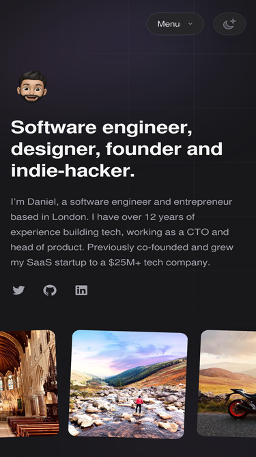 87%i’m daniel, a software engineer and entrepreneur based in london. previously co-founded and grew my saas startup to a $25m+ tech company. i have over 12 years of experience building tech, working as a cto and head of product.