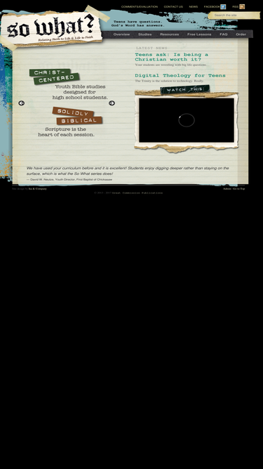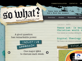 93%so what? is a youth bible study series that is christ-centered and solidly biblical, with an inductive approach. this flexible 13-session series is discussion oriented (with one major q+a each week) and multifaceted, incorporating e-mail and text devotional to complement the session study materials.