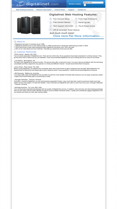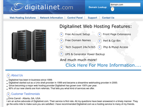 96%Digitalinet is a premier web hosting solutions provider.Digitalinet provides FREE Domains with web hosting! Mysql, Php, FrontPage, Tcl, Python and much more.