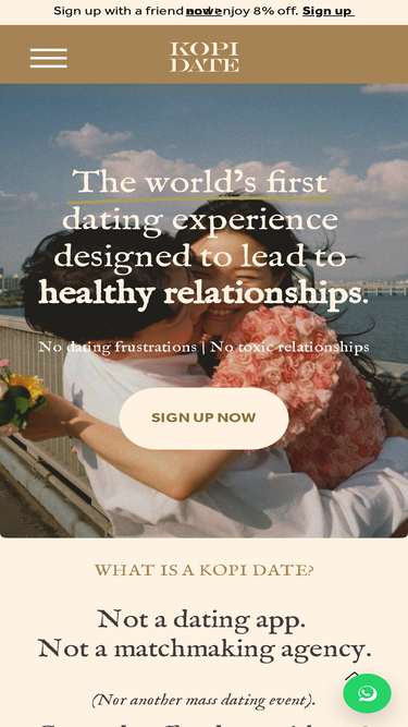 66%Not a dating app. Not a matchmaking agency. Meet new people in Singapore and enjoy great conversations over coffee! Kopi Date is a dating platform for singles that paves the way for healthy, grounded relationships through exploration, personal growth, and building relationship skills. View Kopi Date