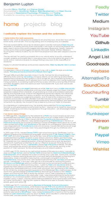 82%website of benjamin lupton. founder of bevry, docpad and history.js. web developer for 10 years. now a trader. studies psychology and philosophy.