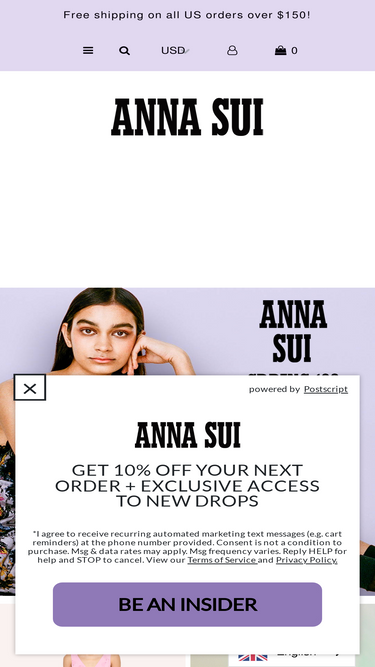 88%SMS/MMS MOBILE MESSAGE MARKETING PROGRAM TERMS AND CONDITIONS Anna Sui (hereinafter, “We,” “Us,” “Our”) is offering a mobile messaging program (the “Program”), which you agree to use and participate in subject to these Mobile Messaging Terms and Conditions and Privacy Policy [Insert URL Link to your Privacy Policy] (th