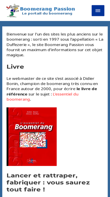 82%Découvrez le livre de référence en français sur le boomerang : L'essentiel du boomerang, écrit par Didier Bonin et Olivier Duffez, 192 pages en couleurs.