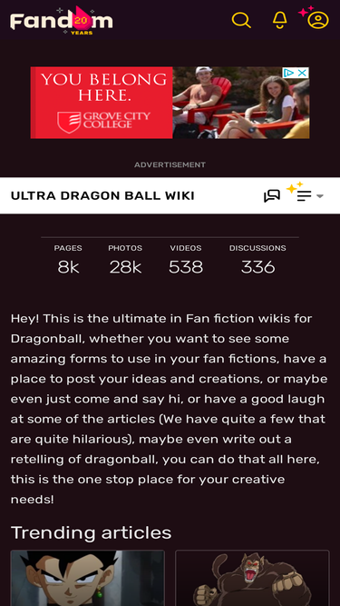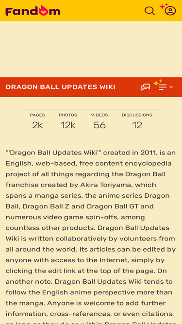 68%Hey! This is the ultimate in Fan fiction wikis for Dragonball, whether you want to see some amazing forms to use in your fan fictions, have a place to post your ideas and creations, or maybe even just come and say hi, or have a good laugh at some of the articles (We have quite a few that are quite hilarious), maybe even write out a retelling of dragonball, you can do that all here, this is the one stop place for your creative needs!