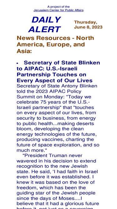 98%daily alert is a digest of news and commentary about israel and the middle east, published by the jerusalem center for public affairs. all items are linked to their original sources. topics include israel's security challenges, iran, syria, lebanon, egypt, palestinians, hamas, hezbollah, al qaeda, gaza, west bank, terrorism.