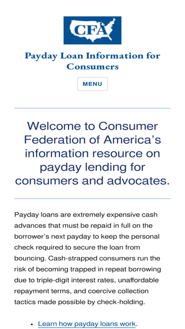 PaydayLoanInfo.org is the Consumer Federation of America's information resource on payday lending for consumers and advocates.