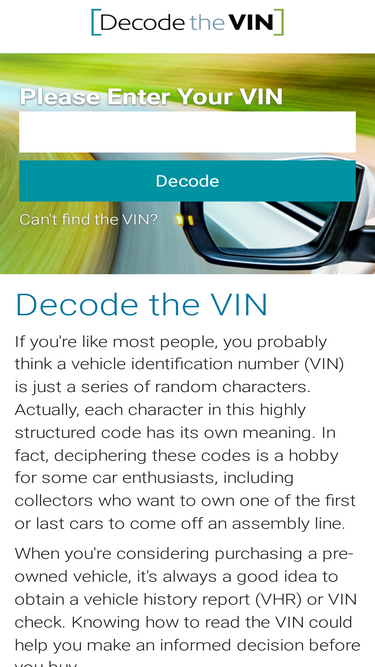 90%Free VIN decoder. Learn what all the different characters in your vehicle identification number (VIN) mean with our simple guide.