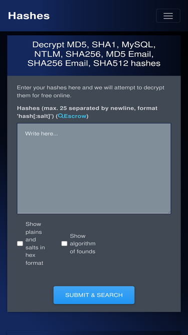 78%decrypt and crack your md5, sha1, sha256, mysql, md5 email, sha256 email, and ntlm hashes for free online. we also support bcrypt, sha512, wordpress and many more.