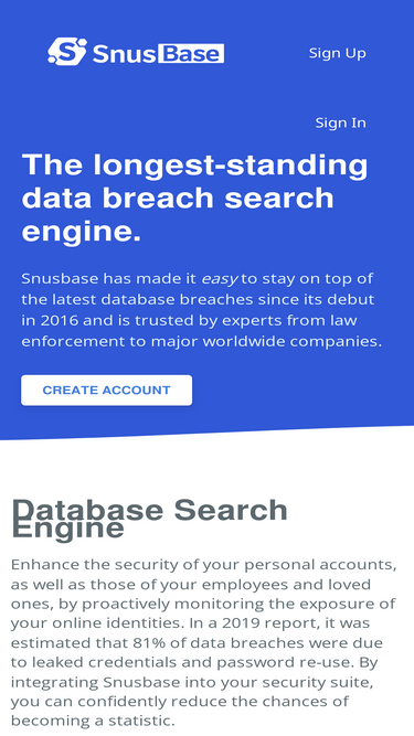 86%Snusbase makes it easy to stay on top of the latest database breaches and makes sure you and your closest stay safe online.