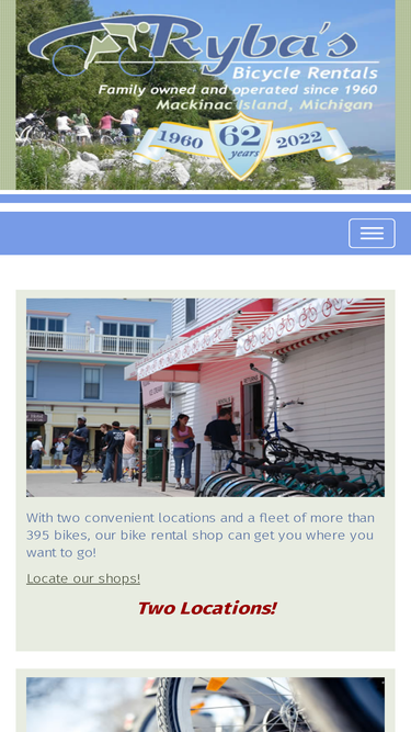 100%ryba's bicycle rentals on mackinac island, michigan since 1960. we offer tagalongs, single and double stroller, electric wheelchairs, mountain, tandem and single speed bikes.