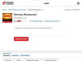 83%Dennys Restaurant has 1478 reviews (average rating 2.3). Consumers say: Can get in contact with them. need help with password, Great experience!
