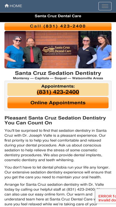 97%santa cruz area sedation dentistry with santa cruz dental care - phone (831) 423-2400 for a gentle santa cruz sedation dentist in the monterey, capitola, soquel and watsonville ca with joseph valle, d.d.s. learn how conscious sedation can help you overcome dental anxiety, phobias or fear of the dentist. talk to dr. valle about iv sedation, nitrous oxide (laughing gas) and dental anesthesia to find the best option for you. we also offer cerec technology and invisalign braces in santa cruz county.