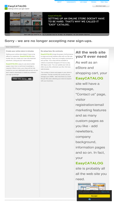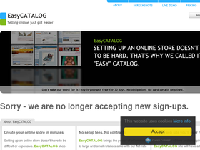 100%easycatalog is a low-cost ecommerce web-based online store builder. it provides a fully hosted shop storefront with a worldpay or paypal shopping cart and admin pages that allow you to add, modify and delete stock items, pictures and custom pages in your store as often as you like.