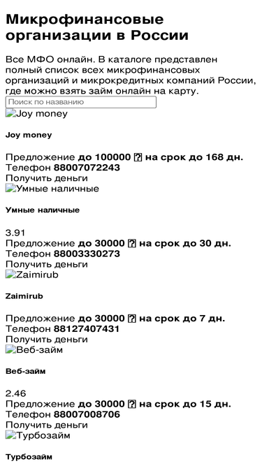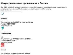 100%Все МФО онлайн. В каталоге представлен полный список всех микрофинансовых организаций и микрокредитных компаний России, где можно взять займ онлайн на карту.