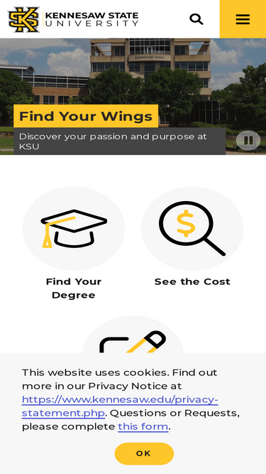 93%as one of georgia's most innovative institutions in teaching and learning, kennesaw state university offers undergraduate, graduate and doctoral degrees across two metro atlanta campuses. kennesaw state is a member of the university system of georgia and the third-largest university in georgia.