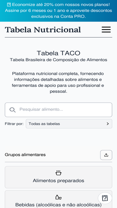 100%Tabela TACO é a tabela nutricional referência em alimentos consumidos no Brasil. Pesquise por uma grande variedade de alimentos de forma simples.