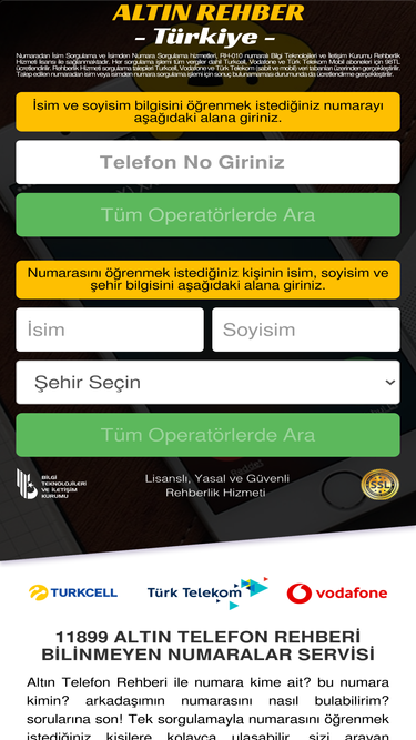74%altın telefon rehberi bilinmeyen numaralar servisi ile 11899'a sms göndererek ya da arayarak numaradan i̇sim - i̇simden numara sorgulamalarınızı yapabilirsiniz.