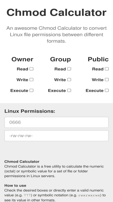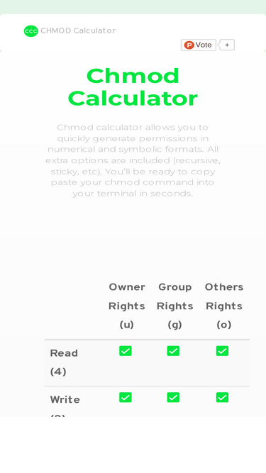 87%quickly generate permissions in numerical and symbolic formats. all options included (recursive, sticky, etc). ready to copy paste to your terminal in seconds.