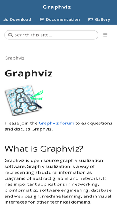 97%Please join the Graphviz forum to ask questions and discuss Graphviz. What is Graphviz? Graphviz is open source graph visualization software. Graph visualization is a way of representing structural information as diagrams of abstract graphs and networks. It has important applications in networking, bioinformatics, software engineering, database and web design, machine learning, and in visual interfaces for other technical domains.