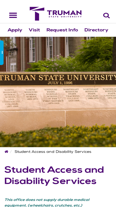 99%The Student Access and Disability Services Office at Truman helps address the needs of individuals with disabilities and provides guidance for adjustment to the University community.