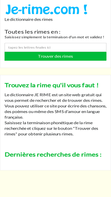 vous cherchez une rime ? que ce soit pour un chanson, un poème ou une exercice d'écriture, le dictionnaire des rimes vous aidera efficacement à pour trouver la rime que vous recherchez.