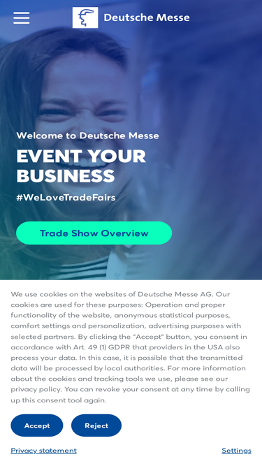 100%Die Deutsche Messe Hannover veranstalten jährlich mehr als 150 Messen und Events im In- und Ausland. Unsere Veranstaltungen sind die wichtigsten Geschäfts-, Wissens- und Inspirationsplattformen ihrer jeweiligen Branche.