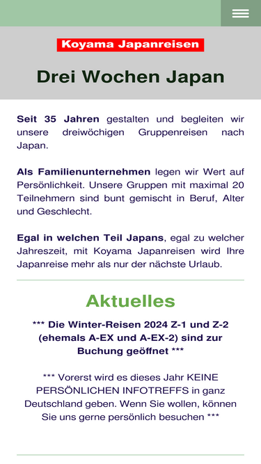 100%Angaben gemäß § 5 TMG: Anbieter: KOYAMA Japanreisen Inh. Shoji Koyama / 小山章司 Bensberger Straße 181 D-51503 Rösrath Kontakt: + 49 (0) 2205 875 71 Fax. + 49 (0) 2205 875 20 (zur Zeit defekt!) Email: koyama-japanreisen@t-online.de Webseite: Koyamajapanreisen.de Steuernummer 204 / 5192 / 0388 IHK Mitglieder Nr. 57805219