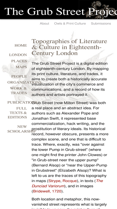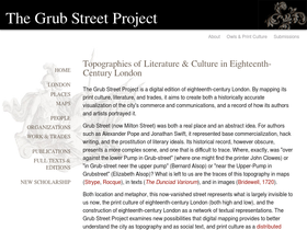 95%the grub street project is an edition of 18th-century london, containing works published and sold in london, information about the city and its people and trades, and annotated maps of london from the 16th to the 18th century.