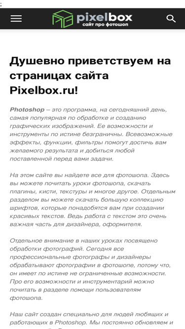 62%душевно приветствуем на страницах сайта pixelbox.ru! photoshop - это программа, на сегодняшний день, самая популярная по обработке и созданию графических изображений. ее возможности и инструменты по истине безграничны. всевозможные эффекты, функции, фильтры помогут достичь вам желаемого результата и добиться любой поставленной перед вами задачи. на этом сайте вы найдете все для фотошопа. здесь вы можете почитать