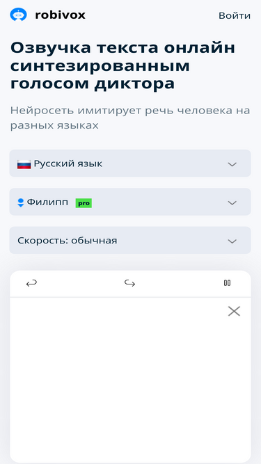 92%преобразовать текст в голос и скачать качественную озвучку можно с помощью нейросети robivox. озвучивание русского и иностранного текста голосом бота-диктора. ✓ бесплатное тестовое время. ✓ аудио mp3 и wav.
