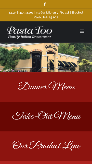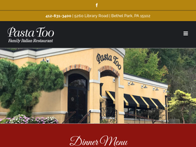 100%dinner menu take-out menu our product line catering services the ultimate italian dining experience. authenticity at pasta too, we bring italy to bethel park. not only do we serve an authentic italian