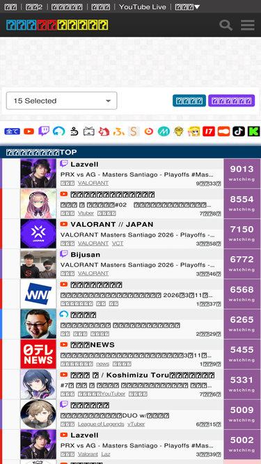 87%ニコニコ生放送/ツイキャス/fc2ライブ/ふわっち/showroom/openrec.tv/twitch/youtube live/mirrativ/ドキドキ live/kukululive/17 live/spoon/bigo live/tiktok live/hakuna/live.me/instagram live/mildom等の各配信サイトで放送されているライブから集計してまとめてランキング形式で一覧表示しているサイトです。