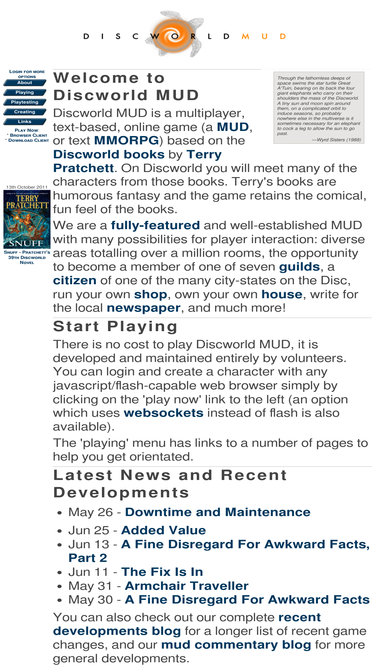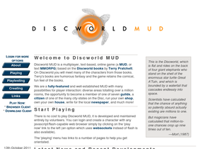 32%discworld mud is a multiplayer, text-based online game based on the discworld books as written by terry pratchett. on discworld you will meet many of the characters from those books. terry's books are humorous fantasy and the game retains the comical, fun feel of the books.