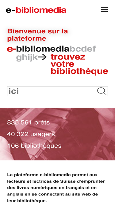 100%la plateforme e-bibliomedia permet aux lecteurs et lectrices de suisse d’emprunter des livres numériques en français et en anglais en se connectant au site web de leur bibliothèque.