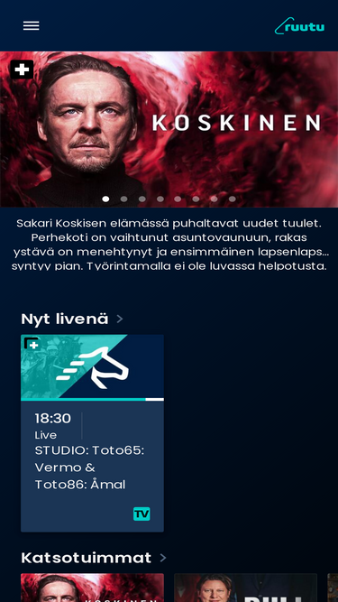 89%Ruutu - ei koskaan tylsää hetkeä. Katso Suomen suosituimmat sarjat, leffat, lastenohjelmat ja urheilu yhdessä paikassa. Kokeile heti.