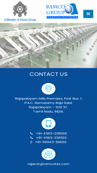 100%Meet UsRajapalayam Mills Premises, Post Box: 1, P.A.C. Ramasamy Raja Salai, Rajapalayam – 626 117. Tamil Nadu, INDIA. Call Us +91-4563-235666 +91-4563-236520 +91-99943-59666 Mail Usrajacot@ramcotex.com Get in touch with us for your Requirements