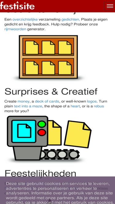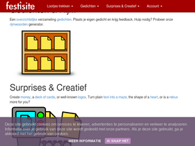 festisite ondersteunt bij digitale creativiteit, handig voor surprises met de feestdagen. probeer onze sinterklaas- en liefdes- gedichten generator, maak je eigen gepersonaliseerde bier of whiskey labels, of plaats je foto op speelkaarten of maak je eigen geld.