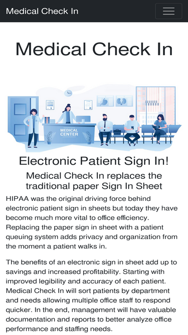 100%medical check in is a simple patient sign in system to improve patient organization and hipaa compliance for physicians, hospitals, clinics and labs. call today for a free 14 day trial. $399/year.