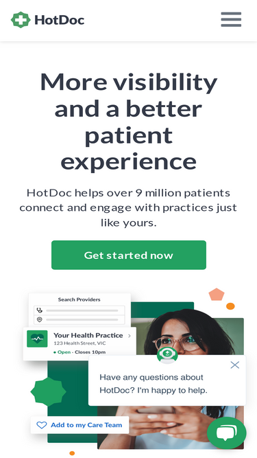 75%HotDoc for Practice is a patient engagement platform for GP, Dental, Allied Health, Specialists & other practitioners. Start a free profile!