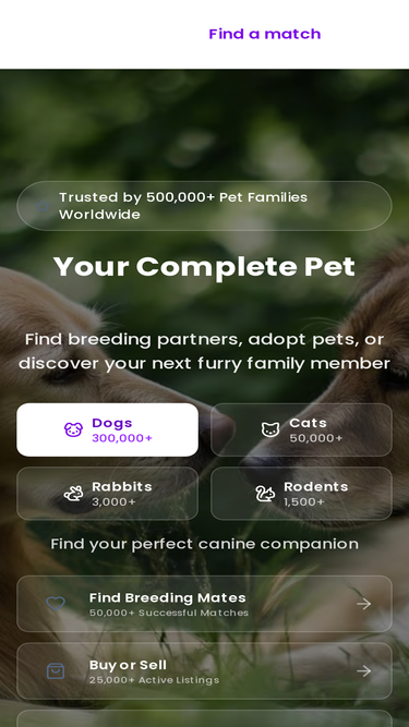 84%Find breeding partners, adopt pets, or buy from verified sellers. Trusted by 500,000+ families.
