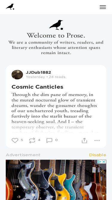 89%Prose. is an online social network community for readers and writers. Authors can easily create, share, and publish their work for free. Make money as a new author, and support the writers you care about.